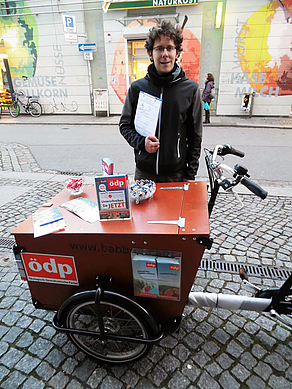 Seit ein paar Monaten besitzt der Landesverband Sachsen ein Lastenfahrrad. Es ist mit ein paar großen und kleinen ÖDP Aufklebern versehen. An den hölzernen Seiten der Box und vorne wurden zusätzlich ein paar Flyerhalter montiert. Der Landesverband auf Werbetour!